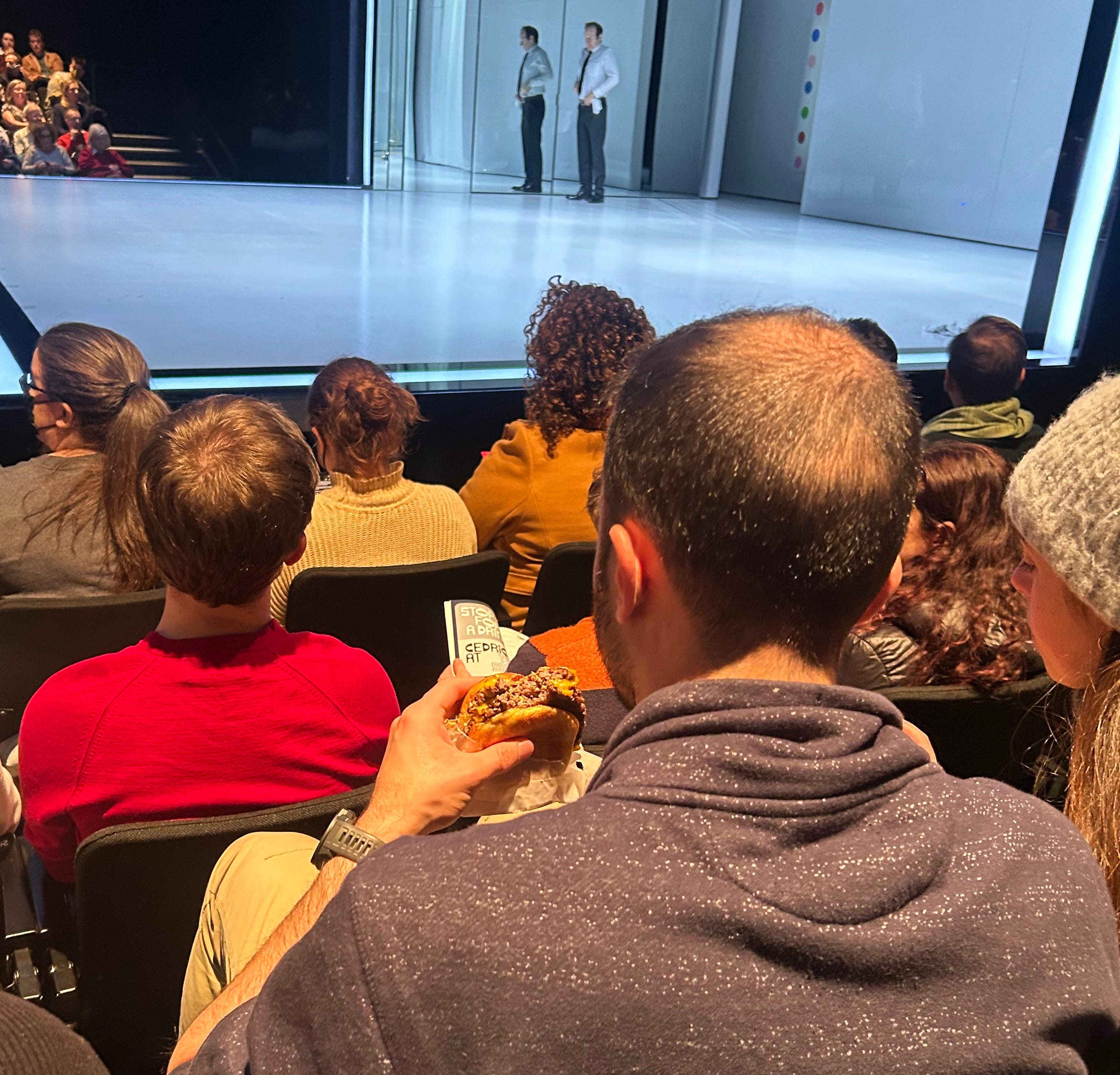 I leave you with my own lingering image of Here We Are — a musical mostly about not eating. As the lights came down for the show to begin, a sparkly-garbed 20-something couple seated right in front of me (three rows from the stage, on the side) pulled out two freshly wrapped, steaming cheeseburgers — as if they’d been waiting for this perfect, curtain-going-up moment, to begin eating. And eat they did, throughout a first act blatantly premised upon the notion that no one onstage can get anything to eat.